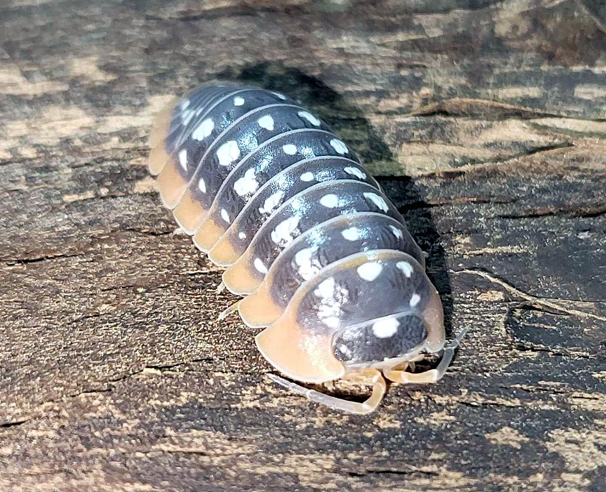 Additional info: Very big isopod. Five lines of patterns.  It prefers slightly dryer environment with one side of enclosure being damp. I would not recommend this species for a beginner. Moderate difficulty in keeping.